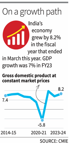 - India’s real Gross Domestic Product (GDP) for FY24 is estimated to have grown by a faster-than-projected 8.2%, quickening from FY23’s 7% pace, the National Statistical Office’s (NSO) provisional estimates.